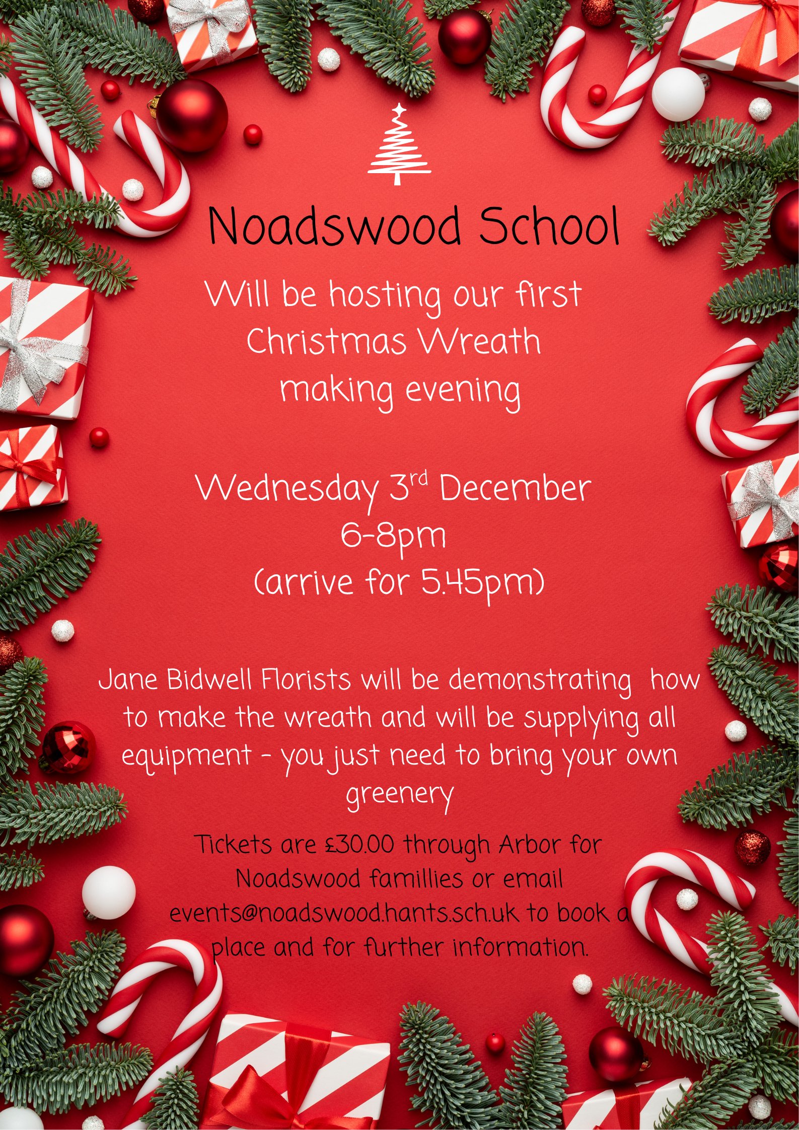 Tickets are on Sale through the Arbor Shop for Noadswood Families, or can be purchased by clicking on this link (for non-Noadswood families): Wreath Making Tickets